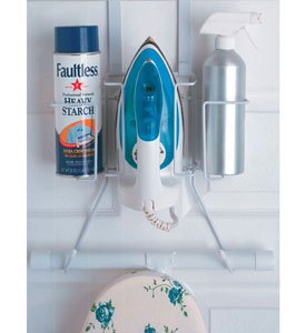 Create convenient hanging storage for your important ironing accessories with the Over the Door or Wall Mount Iron and Ironing Board Holder. This handy laundry room organizer can be mounted to a wall or storage cabinet and also includes over the door hanging hooks that fit on doors measuring 1 3/4 inches thick. Ironing Board and Iron Storage Rack Features: Sturdy heavy gauge steel wire construction. Wire has a durable white epoxy finish safe for storing a warm iron. Includes mounting hardware for installation on a wall existing storage cabinet or wood door. Optional over the door hanging hooks allows for simple installation on doors measuring 1 3/4 inch thick. Two large angled storage hooks can accommodate a T leg or Y leg style ironing board. Dual side storage baskets great for holding a can of spray starch and water bottle. Helps maximize available storage space in a laundry room or utility closet. Great ironing accessory for the laundry room dorm room or apartment living.